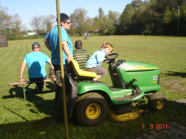 O cortador de grama com um lindo espectador a bordo!